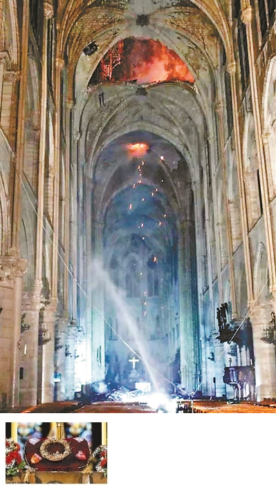 不过,不幸中的万幸是,圣母院内保存的众多艺术品,大多数都被抢救了出来或免于被焚毁。法国内政部公布的统计数据显示,除教堂墙体得以保全外,还有至少30%的艺术品都得到了抢救性保护,其中就包括重量级文物耶稣受难荆棘冠和圣路易长袍。此外,虽然教堂穹顶已然洞口大开,但内部祭坛和十字架完好无损。
