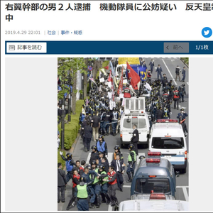 左翼团体扬言5月1日新天皇登基时,还将在各地举行示威抗议活动。预计支持天皇制的右翼团体也将大批成员出动阻挠。左、右两派的对峙让日本警方绷紧神经。