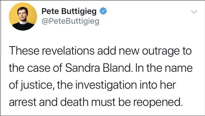 而民主党总统参选人皮特·布蒂吉格则称:“新披露的内容为布兰德一案增添了新的愤怒,以正义之名,针对她死亡和被捕的调查必须重新开始。”