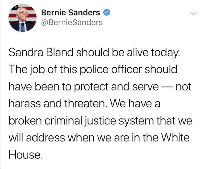 美国总统参选人伯尼·桑德斯在推特上转发了这条视频,并表示:“布兰德本应该能活到现在,这名警官的职责应该是保护和服务,而非骚扰和恐吓。我们拥有一个破碎的犯罪司法系统,等我入驻白宫以后会着手解决这一问题。”