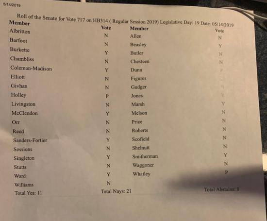 根据美国媒体的报道,这项已经在美国引起众多女性愤怒抗议和谴责的法律,是在继前些天以74-3的得票数通过了阿拉巴马州的众议院后,于当地时间周二晚上(即北京时间今天上午)通过了当地参议院的。得票数是25票赞成,6票反对,1票弃权。