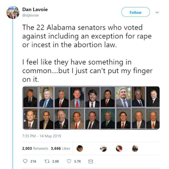 但有美国网友却发现,持上述这种观点、并最终拒绝允许被强奸女性的堕胎的20多名参议员,无一例外都是不用忍受生育之苦的白人男性…。。