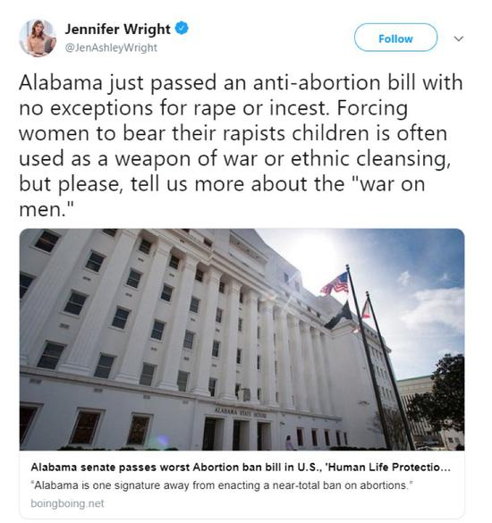 所以,这个法律目前已经在美国网络上遭到了尤其是女性的强烈谴责和抵制。其中一名美国的女性作家甚至激动地表示“逼迫女性生下强奸犯的孩子通常是种族清洗中的一种做法”:
