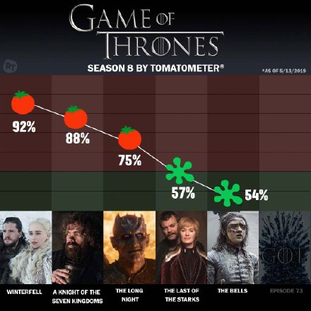 不仅如此,《权力的游戏》第八季的剧情也备受诟病。第五集中龙母骑龙屠城的举动被观众评价“编剧疯了吗?”而该剧第四集IMDB评分为6.4分,第五集为7.2分,相较前三集8+的分数,也再次创造新低。