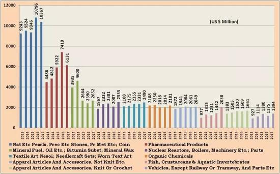 小编注意到,印度出口至美国的十大物品,排名前三的分别是珠宝、医疗产品和矿物燃料等。
