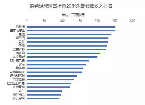 横向比较,根据德勤的统计,2017-2018赛季,转播收入前20的俱乐部中,有9支来自英超。而且,埃弗顿、纽卡斯尔联、西汉姆联这些非豪门球队的收入比法甲豪门巴黎圣日耳曼、意甲的米兰双雄都要多。
