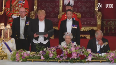 视频:违反皇家礼仪?特朗普在国宴上疑触碰英女王后背