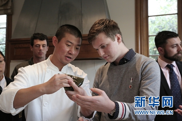奥利弗·伍德曼在专业厨师的指导下尝试包粽子。郝亚琳 摄 新华网发