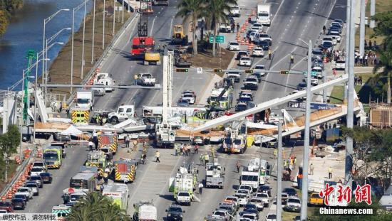 资料图:当地时间2018年3月15日,美国佛罗里达州迈阿密市一座过街天桥坍塌,图为事故现场。