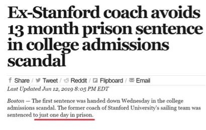 所以,这位将持有虚假入学材料的中国“步长制药”公司董事长的千金,作为帆船运动员违规录取到斯坦福大学的原帆船队教练,最终因为他承认的一项“共谋欺诈”的罪名,以及积极配合调查、良好的认罪表现、他律师在法庭上打的“同情牌”,还有之前带过的运动员和家长写的支持他的联名信,而仅被判入狱1天……