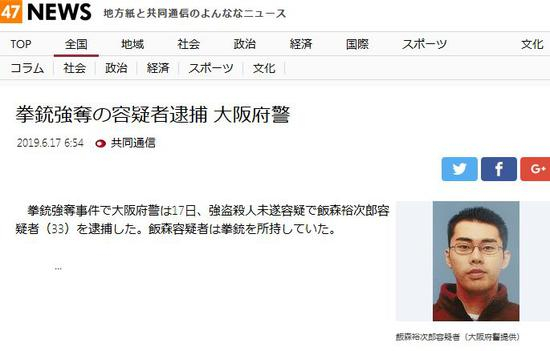 日本共同社17日报道称,当天,日本大阪府警以抢劫杀人未遂的嫌疑,将33岁的嫌疑人逮捕。报道称,嫌疑人曾持有手枪。其住所不定,职业不详。
