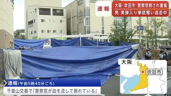 据日本《朝日新闻》报道,当地时间16日凌晨5时40分许,有男子报案称,在大阪府吹田市千里山警亭附近,发现一名受伤倒地的警察,左胸插着菜刀。据调查,26岁的巡警古濑铃之佑在执勤时被砍成重伤,嫌犯抢走其一把装有5发子弹的配枪潜逃。古濑铃之佑现已被送进医院抢救,具体伤情不明。