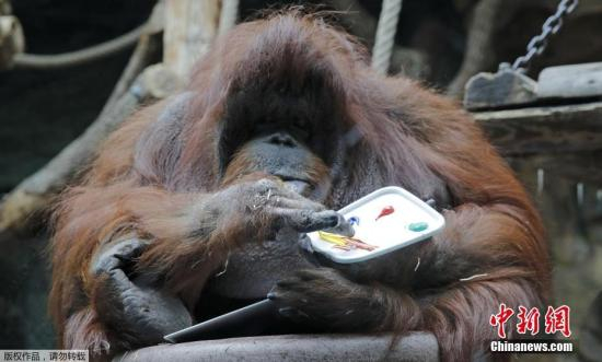 当地时间2019年6月13日,法国巴黎,巴黎植物园里的动物园猩猩Nenette在50岁生日到来前夕展示自己的绘画技艺。