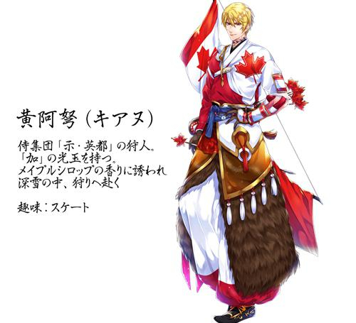 加拿大国旗名“枫叶旗”或“一叶旗”,国旗中间的白色代表加拿大广阔的国土,两侧的红色代表海洋,中间的枫叶则是加拿大国树。该角色被称为“极寒大地的支配者,北美大陆的温柔担当”,身着名为“明布流理衣赋”的狩猎装。汉字记为“加奈陀”。
