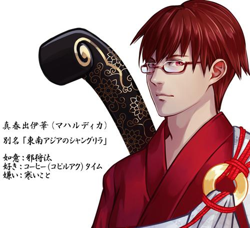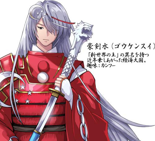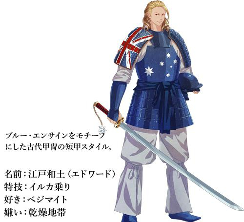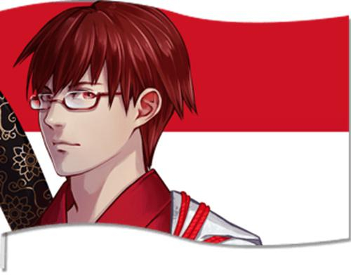 日本国旗被称为“日章旗”,中心一个红色的太阳,周围是全对称的白色。角色撑着日本国旗配色的伞,身着名为“日之丸”的长衣。英文记为“Japan”。