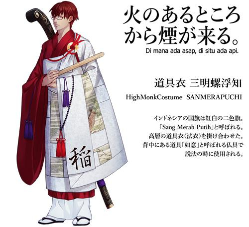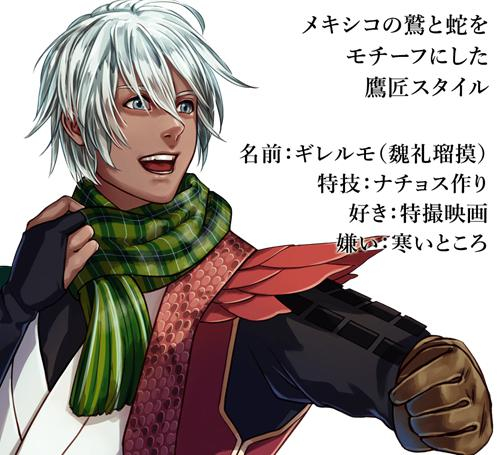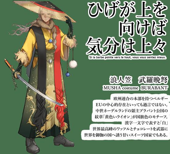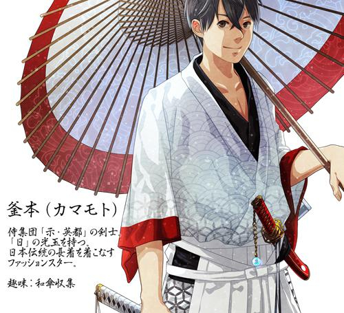 角色名“釜本”,持有“日”之光玉,身着日本传统衣装的剑士,也是一名“时尚明星”。爱好是收集日本伞。