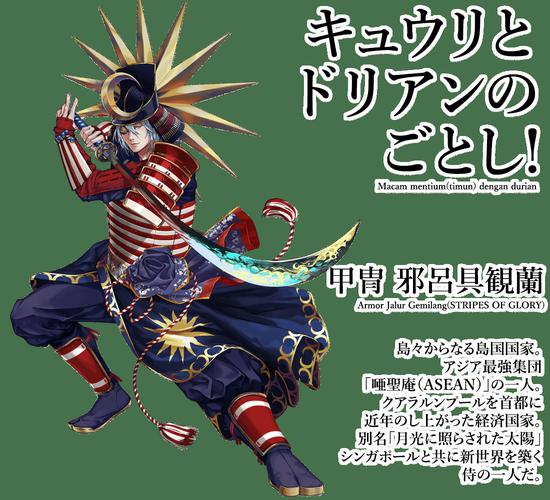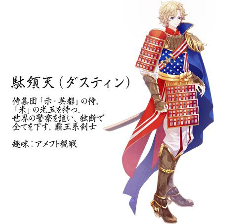 身披“星条旗”、“合众国旗”,旗帜又名“古之荣光”,装甲名“大流度具吕利”。星星代表美国的州。被称为“世界警察”,在娱乐、电影、文化等娱乐界席卷世界。汉字记为“亚米利加”,也被称为“米利坚”。