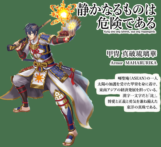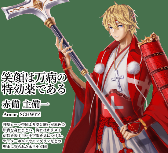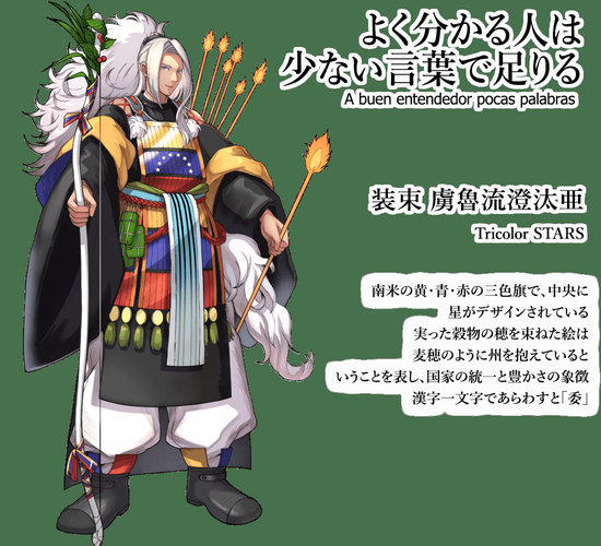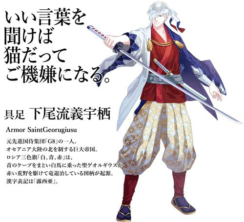 “听到好话,猫也会开心的”。国旗由上至下是白、蓝、红三色,角色也以此为主色。装甲名“下尾流义宇栖”。