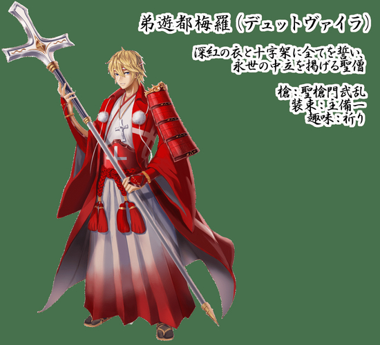 角色名“宇位里阿梦”,是持有“英”之光玉,贵族阶级出身的枪术师。爱好做点心。