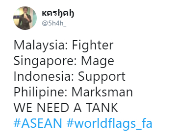 @5h4h_:马来西亚:战士;新加坡:法师;印度尼西亚:辅助;菲律宾:射手。我们需要一个坦克!