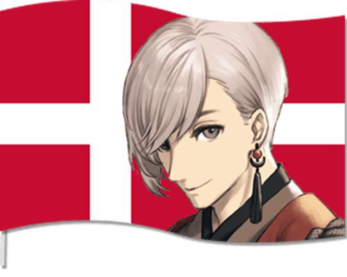 国旗为红色旗面,绘有蓝白色十字。角色身着“蓝十字”装,是斯堪的纳维亚三将军之一,承担着守护北欧的责任。