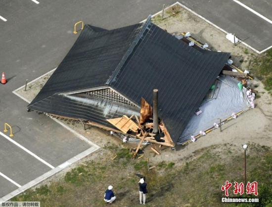 当地时间6月19日,日本山形县筑冈的一处木质房屋屋顶倒塌。 日本山形县附近海上18日晚发生6.7级地震,该县及新潟县震感强烈。
