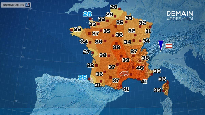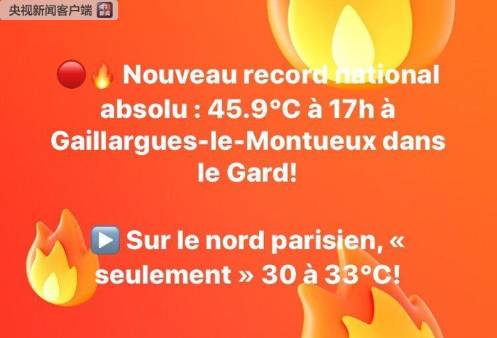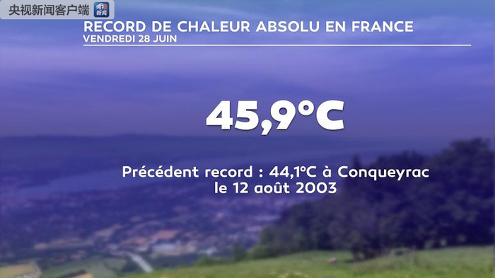 法国当地时间6月28日下午,法国本土历史高温纪录被三次改写,分别是沃克吕兹省的44.3摄氏度、加尔省的45.1摄氏度和45.8摄氏度。法国气象局发布消息,45.8度的历史最高气温是在当地时间28日下午4点被监测到的,位于加尔省加拉尔盖莱蒙蒂厄(Gallargues-le-Montueux)。(央视记者 马瑾瑾)