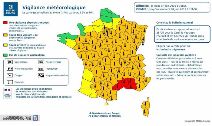早前消息:法国今夏高温屡破历史记录,27日当天,四个省份高温升级到红色预警,这是2003年以来首次,另有78个省份处于橙色预警状态。另据报道,法国气象局16年来首次将罗纳河口省、加尔省、埃罗省、沃克吕省置于高温红色预警之内,预警时间从28日上午10点至29日早晨6点。法国气象局在公报中称,相关地区在此时段的高温会达到42至45摄氏度,因此,2003年8月12日记载的法国境内44.1摄氏度的高温历史记录或被打破。