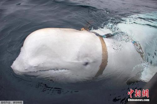 资料图:2019年4月,挪威渔民在挪威北部沿岸水域发现一头穿背带的白鲸。该白鲸十分亲近人,受到当地人的喜爱。