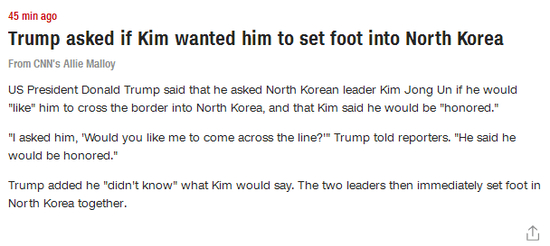 CNN在之后的报道中还谈了一个有意思的细节。这家美国媒体报道称,特朗普说,他问朝鲜领导人金正恩是否“愿意”他跨过边境进入朝鲜,金正恩说他将“感到荣幸”。