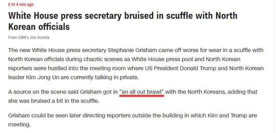 然而有趣的是,在三位国家领导人都对今天的会面给出了极高评价的时候,报道这一事件的美国记者团却一度与朝鲜那边的官方人员发生了一些小冲突。CNN和BBC的报道就都提到美国白宫的新任发言人斯蒂芬妮·格里沙姆(Stephanie Grisham)就被卷入了其中,可能还挂了彩……