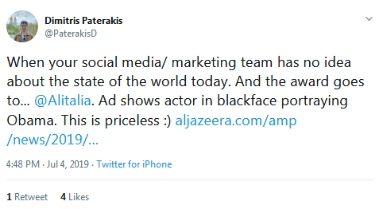 一位推特网友@PaterakisD认为,“黑脸”广告说明意大利航空公司的“社交媒体与营销团队对当今世界现状一无所知”。↓