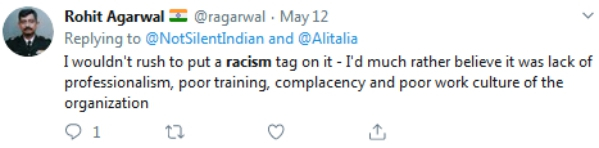 也有网友@ragarwal说:“我不会急着给(意大利航空公司)贴上‘种族歧视’的标签——我宁愿相信,这是因为这家公司缺乏专业素质、缺乏培训,工作文化自满又糟糕。”↓