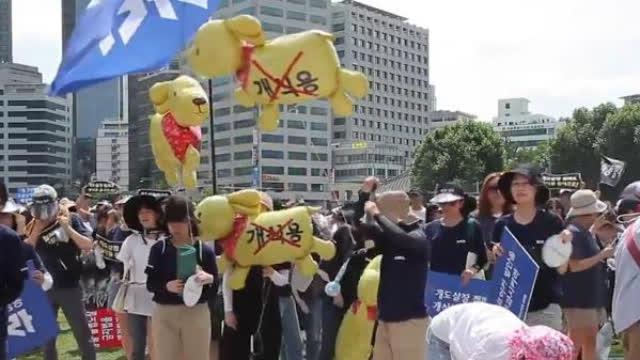 7月7日,韩国首尔,超三百人在首尔市政府前呼吁停止食用狗肉。韩国有三伏天喝狗肉汤的习俗,调查显示该国每年有80万至100万狗被吃。该饮食传统近年招致众多反对声。