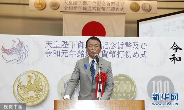 当地时间7月11日,日本大阪,日本造币局当天就新版硬币举行铸造发布会,日本财务相麻生太郎出席。“令和元年”硬币沿用了以往的外观设计。(图片来源:视觉中国)