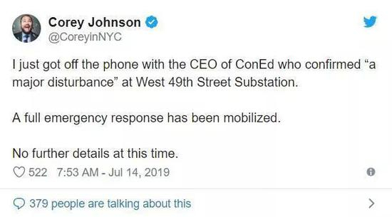 据美联社报道,纽约消防局称火灾始于西64街和西区大道。停电波及到当地地铁运营、商业楼和室内电梯等。断电发生后,Con Edison在社交平台发文称:“我们正在应对曼哈顿西区的大规模停电。”正在爱荷华州进行2020总统竞选的纽约市长白思豪(Bill de Blasio)表示,纽约警方等正在全力应对停电局面。