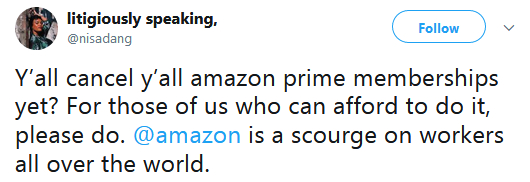 Y’all cancel y’all amazon prime memberships yet? For those of us who can afford to do it, please do。 @amazon is a scourge on workers all over the world。