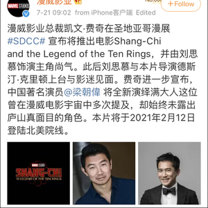 当地时间7月20日晚,在美国圣迭戈国际动漫展(SDCC)上,漫威揭晓了首部华人超级英雄电影《尚气与十戒传奇》(Shang-Chi and the Legend of the Ten Rings)的选角:加拿大华裔演员刘思慕(Simu Liu)将出演男主角尚气,中国香港演员梁朝伟将出演满大人。
