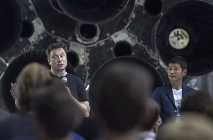 2018年9月17日,美国太空探索技术公司首席执行官马斯克(左)公布该公司第一位绕月飞行的私人游客身份:日本企业家前泽友作(右)。法新社