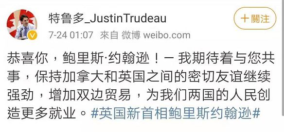 加拿大总理特鲁多也在新浪微博上恭喜鲍里斯当选。