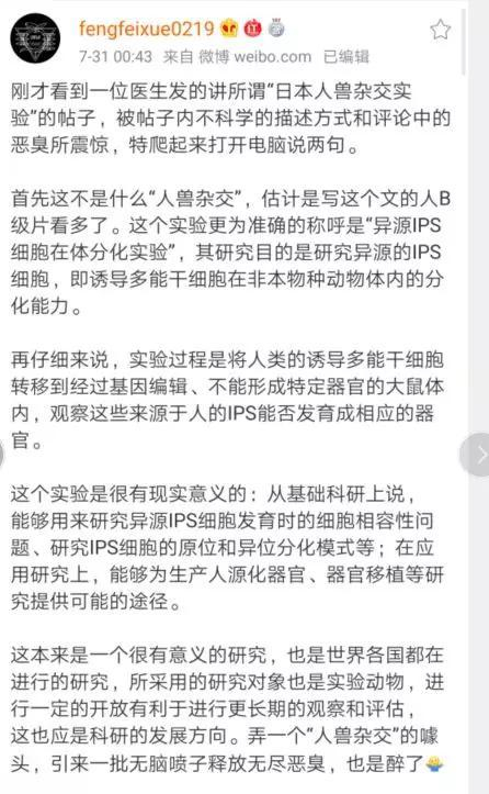 另一个名为@妇产科的陈大夫 的科普账号也持同样的观点,表示所谓的“人兽杂交”实验不过是把人体干细胞导入到动物胚胎内,然后等动物胚胎发育长大后看能否长出人体的器官,以用于研究人体的器官移植问题。