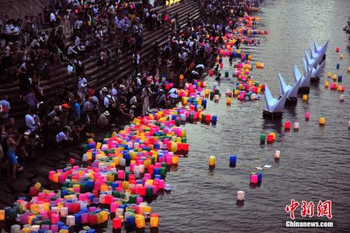 2015年8月6日,在广岛和平纪念公园一侧靠近原子弹爆炸遗址的河流上,民众放流灯笼祈愿和平。中新社发 王健 摄