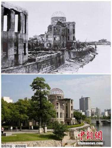 资料图:2015年7月28日,日本广岛原子弹爆炸70周年,对比图重现往昔。图为原子弹爆炸圆顶屋。