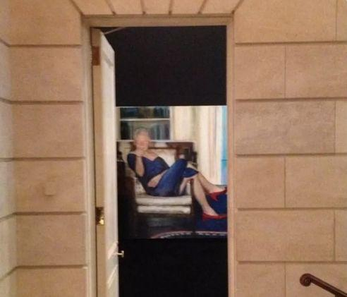 在这么一幅香艳、挑逗和诡异并存的油画中,克林顿身穿蓝色连衣裙和红色高跟鞋,香肩微露,“妖娆”侧躺在白宫的椅子上,甚是“撩人”。