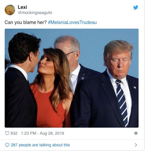 当地时间26日,社交媒体推特美国区出现一个热搜“#MelaniaLovesTrudeau”(梅拉尼娅爱上特鲁多)。