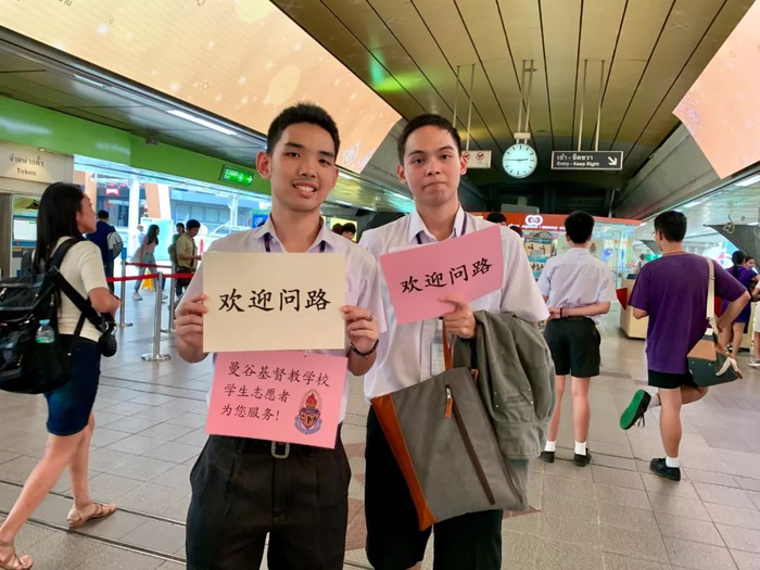 一天,记者在暹罗站出口看到几名身穿校服的男生并排站立。他们每个人手中举着一张A4纸,上面用汉字写着“欢迎问路”“曼谷基督教学校志愿者为您服务!”。现场时不时有中国游客上前打听。 “请问建兴餐厅怎么走?”一名中国游客问道。这群泰国学生立马围成一团,一边对照游客手机上的地图,一边用略显生涩的汉语卖力解答。