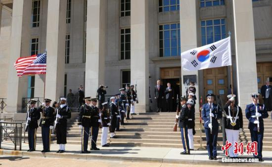 资料图:当地时间2019年4月1日,美国国防部代理部长沙纳汉与韩国国防部长官郑景斗在五角大楼举行会晤。中新社记者 陈孟统 摄