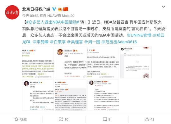 长安街知事(微信ID:Capitalnews)注意到,今天凌晨,包括李易峰、吴谨言、白敬亭、范丞丞、UNINE组合等中国艺人集体表态,宣布不再参加10月9日在上海举办的NBA球迷之夜活动。