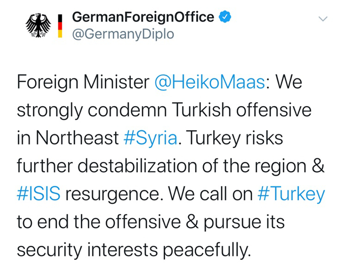 土耳其是北约的重要成员,然而这次打击库尔德人,却让北约来了个实实在在的大分裂——英国表示严重关切、法国外长谴责土耳其单方面行动、德国外长表态最激烈——强烈谴责。北约秘书长斯托尔滕贝格也敦促土耳其保持克制,不要损害打击恐怖组织的成果。
