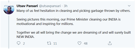 也有网友被莫迪的举动激励,“我们中的许多人在清理和捡别人扔的垃圾时感到犹豫。看到今天早上我们总理清洁我们印度的这些照片,(这种行为会)激励和鼓舞数百万人。我们将为我们的梦想而改变,一定会建设新印度。”